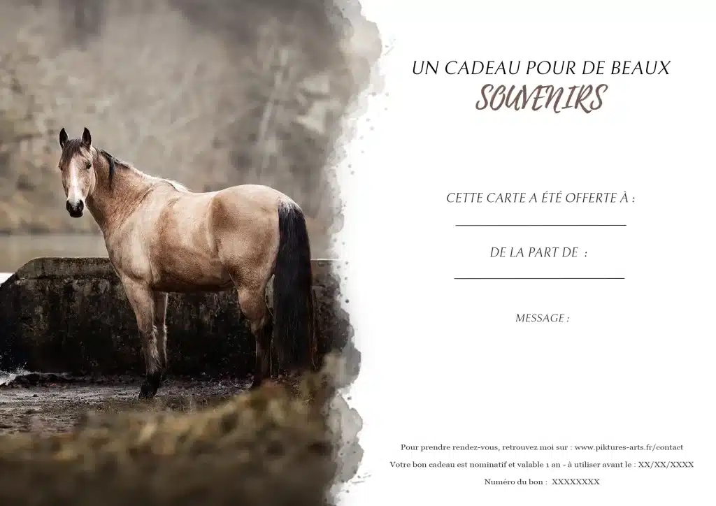Offrez un bon cadeau valable pour une séance photo canine, féline, équine, ou nac. Le montant est utilisable à votre guise pour tout projet. Un cadeau idéal pour ceux qui partagent leur vie avec un compagnon à quatre pattes, c’est une chance de célébrer ce lien unique, de le transformer en un souvenir tangible, qui pourra être chéri à travers les années.